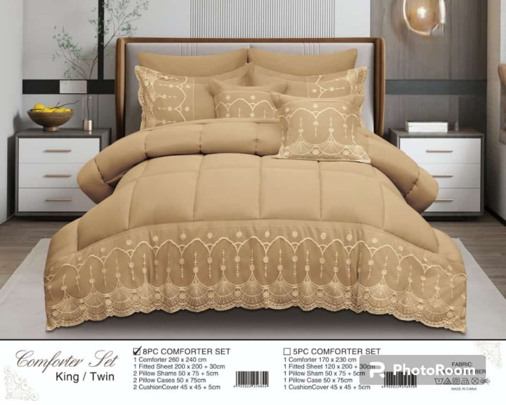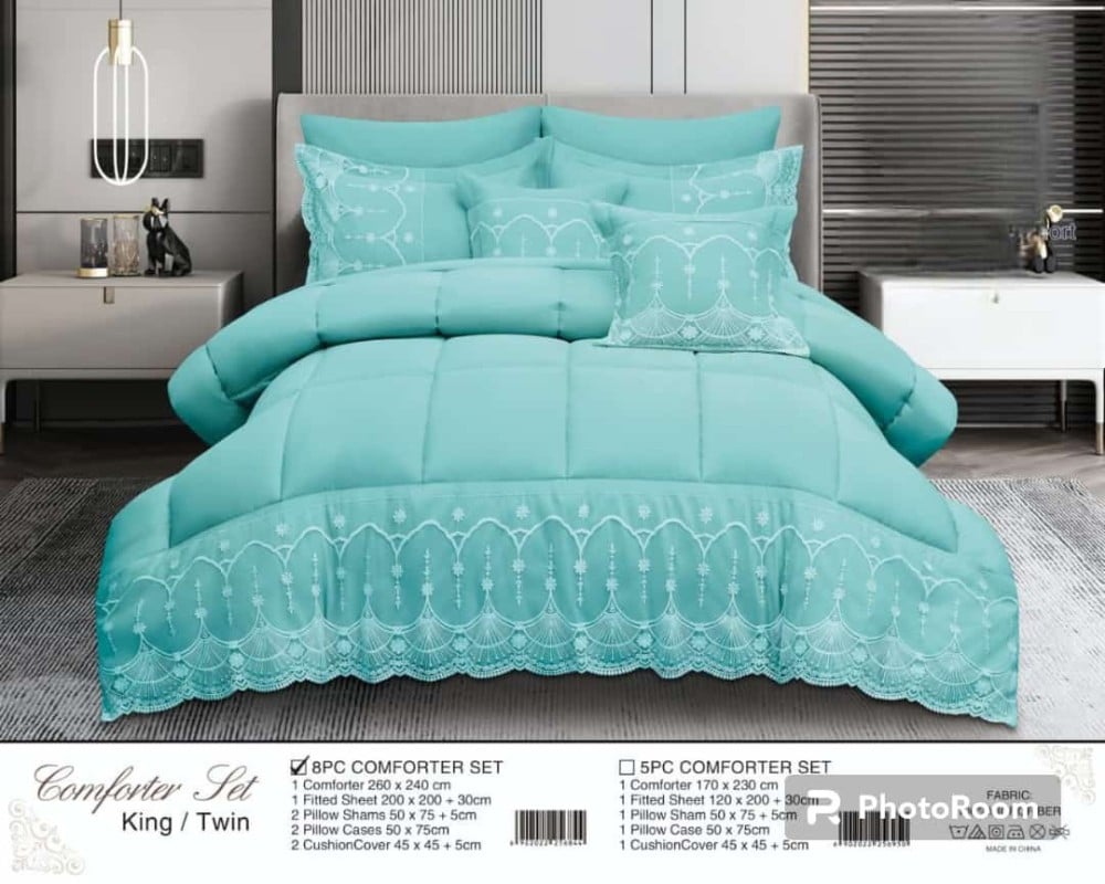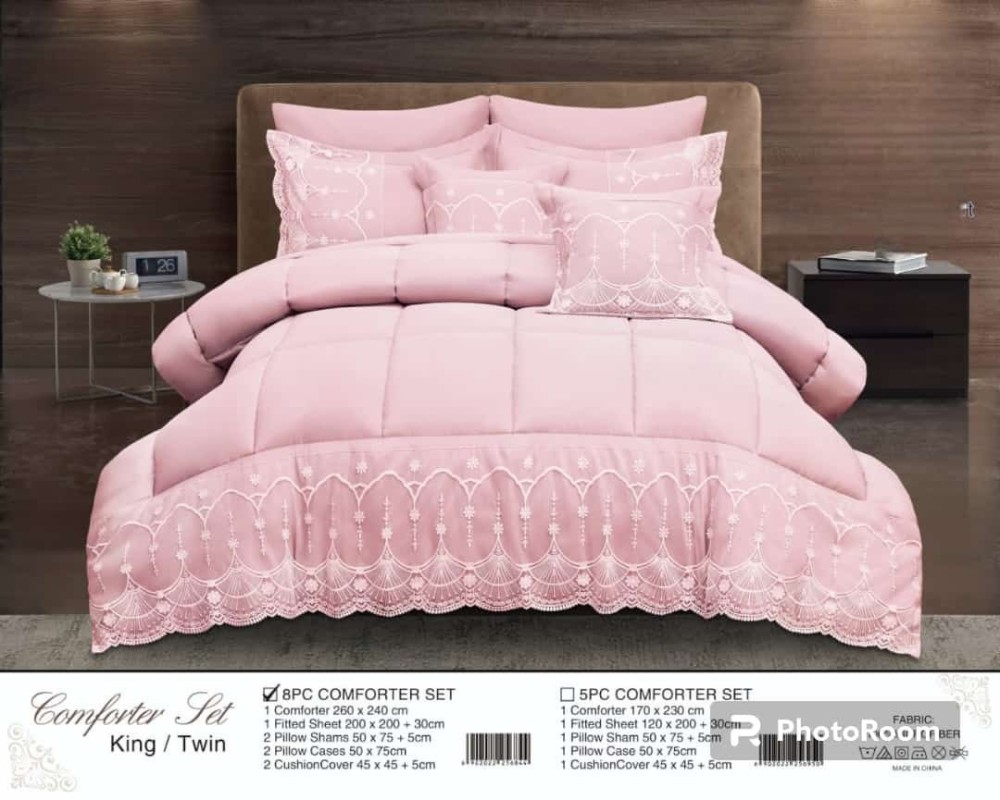 - يأتي المفرش بتفاصيل دقيقة وأنيقة تضفي جمالية إضافية، مثل الكشكش والزخارف الدانتيلية.